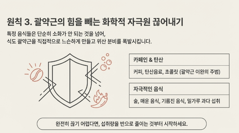 - 커피, 탄산, 술 섭취