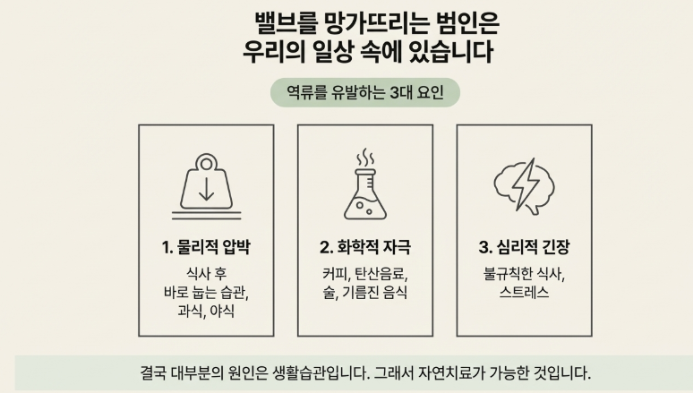 핵심은 위산이 식도로 올라오지 않도록 생활 구조를 바꾸는 것입니다.